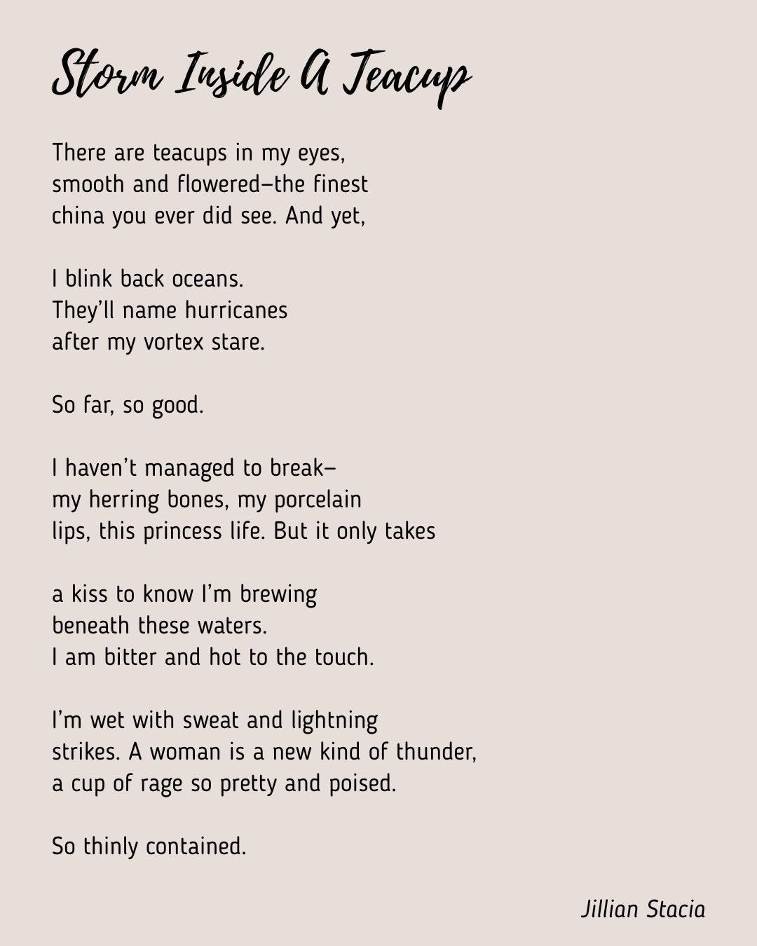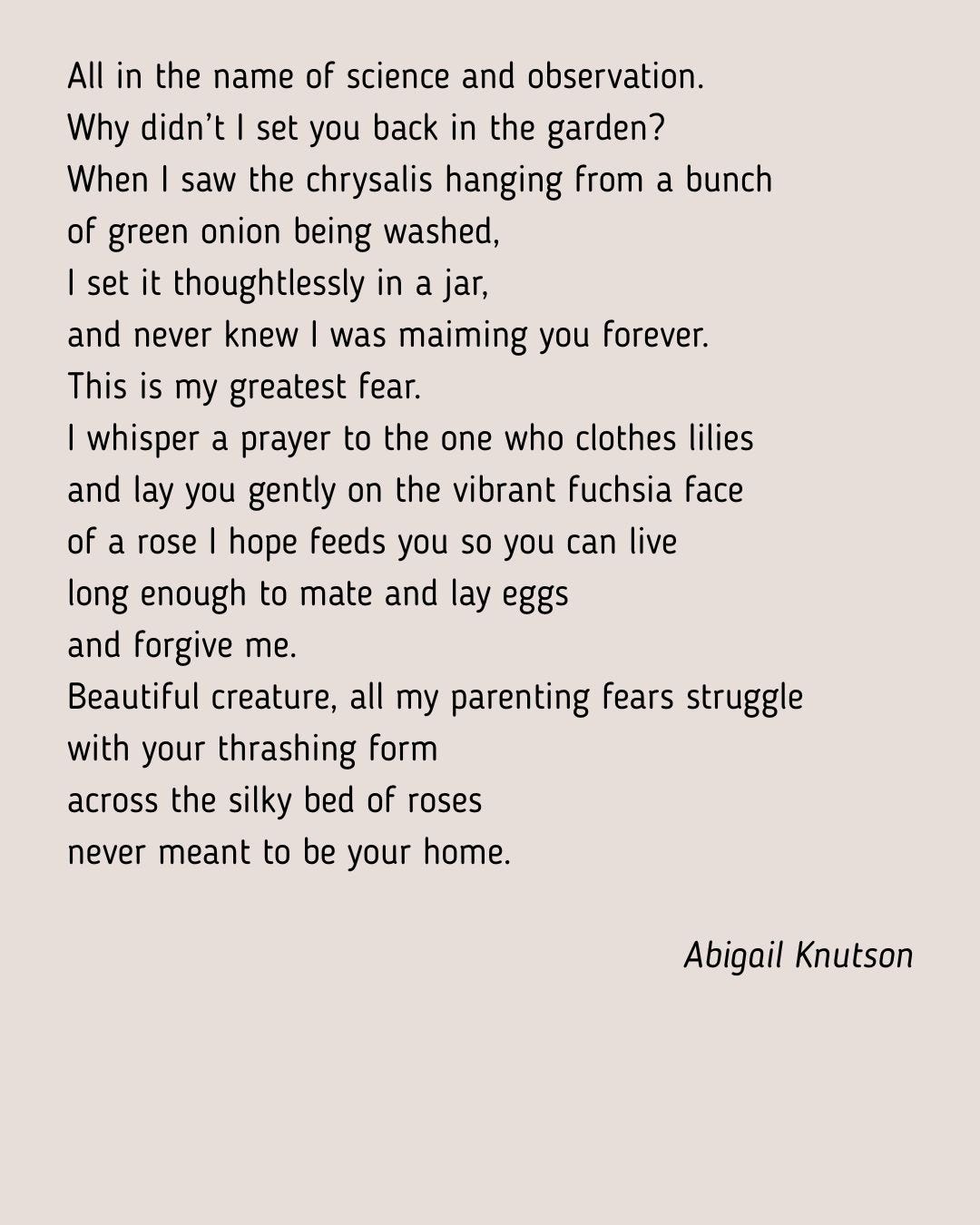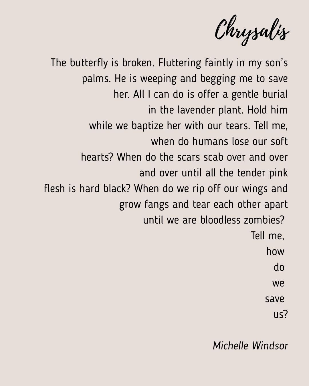 It is hard to believe this came together from an open call for submissions. The themes that emerge organically are woven between voices in different seasons: the dying oak, the maimed butterfly, the eye that has seen this all before, the prom dress, the postpartum wardrobe, the thinly contained teacup, and bubble wrap all resonate with the final image of a chrysalis and leave us asking, "How do we save us?" How indeed? Issue 28 suggests by joining voices together, saying our pain matters, dancing into the light, and by looking back for signs of movement. Thank you for so thoughtfully curating this collection of poems.